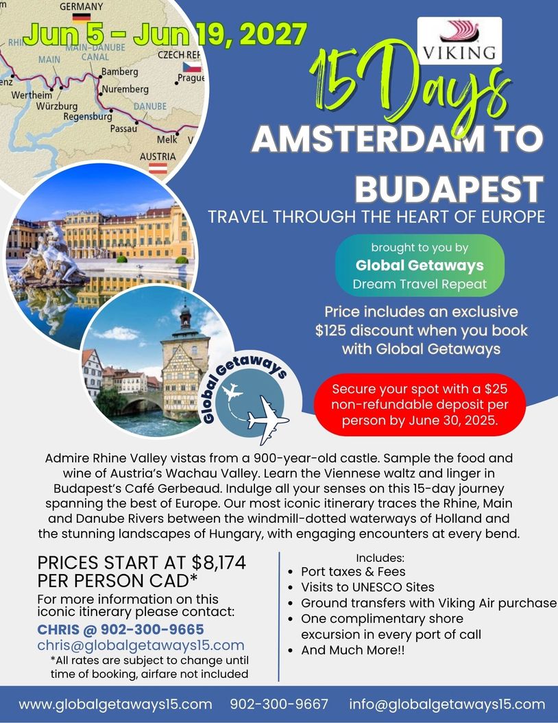 Set sail on an unforgettable 15-day voyage through the heart of Europe with Viking’s Grand European Tour. From the artistic canals of Amsterdam to the regal splendor of Budapest, you’ll glide along the Rhine, Main, and Danube Rivers, experiencing four countries and countless cultural treasures. Explore the soaring Gothic cathedral in Cologne, savor wine in Austria’s Wachau Valley, stroll the grand palaces of Vienna, and lose yourself in the old-world charm of towns like Bamberg, Regensburg, and Passau. Every stop is steeped in history, every view a masterpiece.